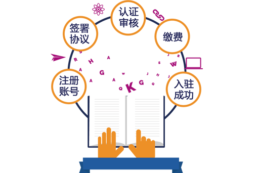 商家自助入驻流程,注册账号、签署协议、认证审核、缴纳保证金和平台使用费,入驻成功
