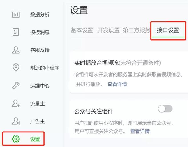 一、使用组件前,需前往小程序后台,在“设置”->“接口设置”->“公众号关注组件”中设置要展示的公众号。