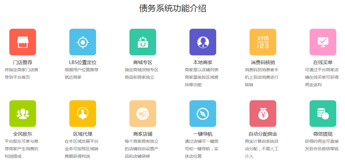 重庆安菲科技公司的债务抵用积分商城系统,采用互联网思维,将别人要不来的债务换成商城的消费券,可拿消费券在商城进行消费,平台集合各种商家,每个商家可根据平台之间的合作模式设置使用消费券比例,债主可消费券+现金模式在平台上进行消费,平台拥有强大的计算功能,商家入驻功能,实用的营销功能,微信支付,APP等主流功能应有尽有。