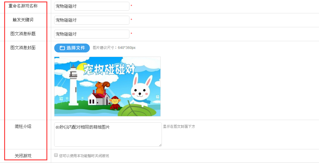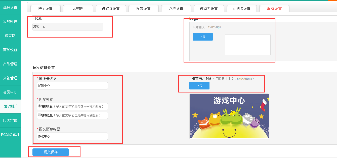 第二步:填写好“游戏中心”的名称、上传LOGO、并设置触发信息设置,最后点击提交保存。注意:1.名称可以自定义,可以叫“游戏中心”,也可以自定义为其他名称;