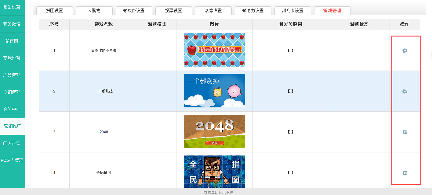 第三步:点击进入“游戏管理”页面。系统内置五个小游戏,点击游戏右侧操作按钮,即可对相应游戏进行操作设置。