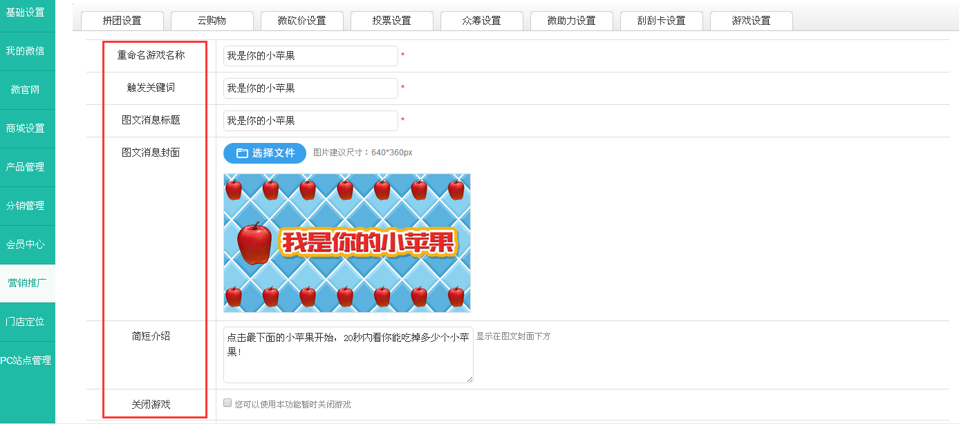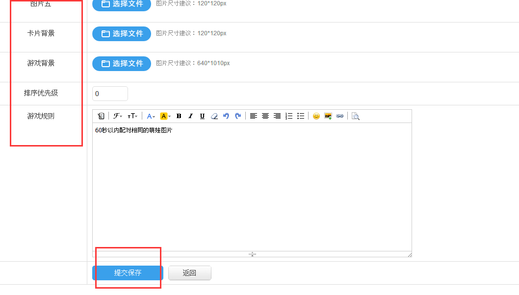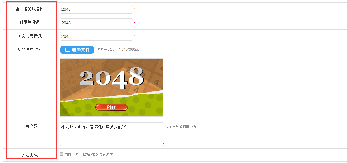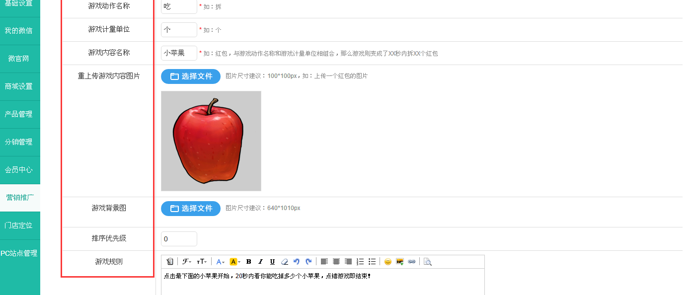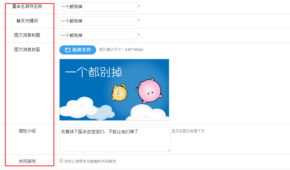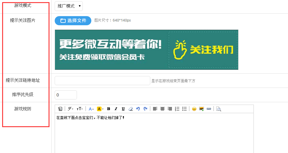 填写好左侧红框突出显示的各个选项,最后提交保存。注意选择游戏模式,推广模式用于推广,积分模式可让游戏玩家获得积分。