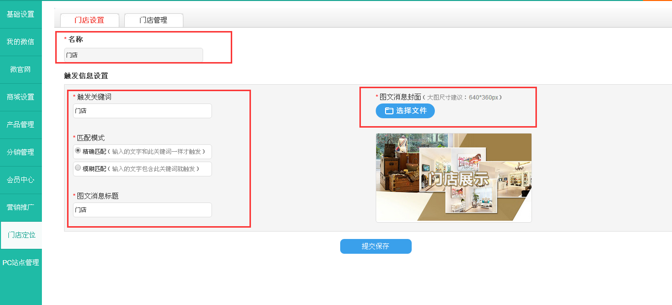 填写门店名称、并设置触发关键词,上传图文消息封面,点保存即可