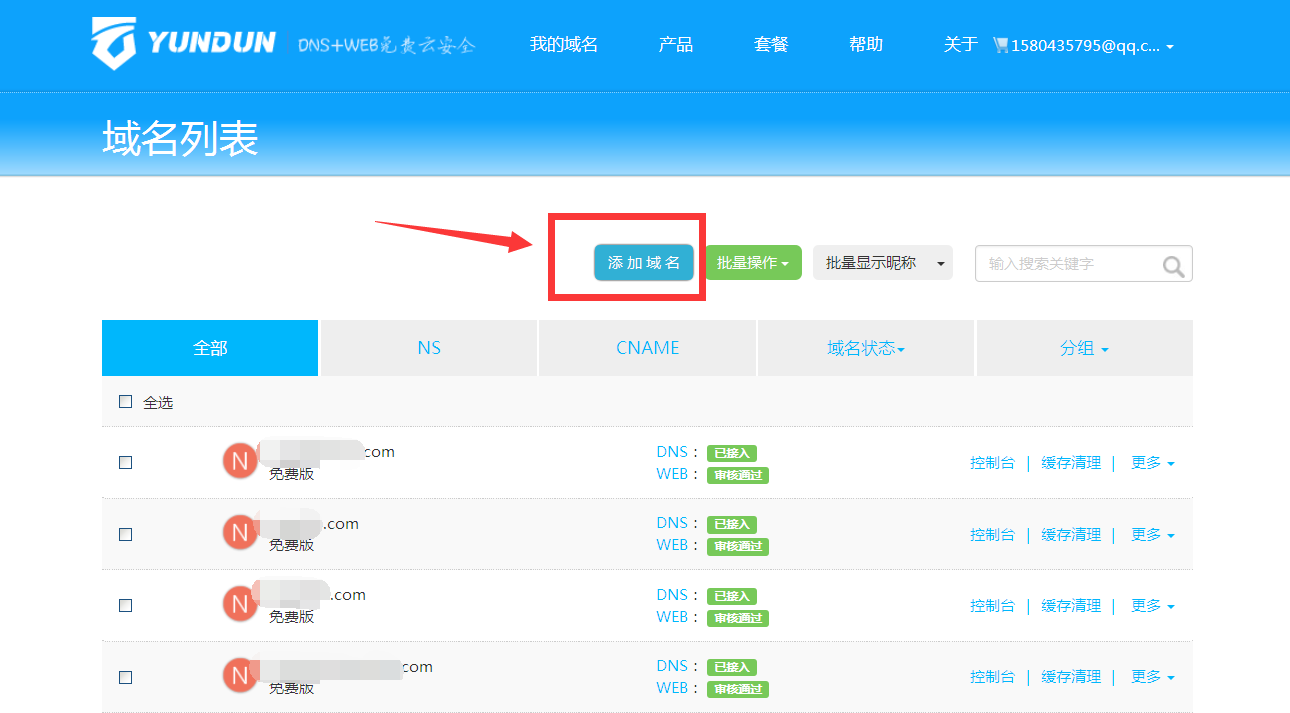 登录云盾之后,点击添加域名。输入已注册购买过的域名。点击添加域名,添加成功后,该域名就会显示在我的域名下面