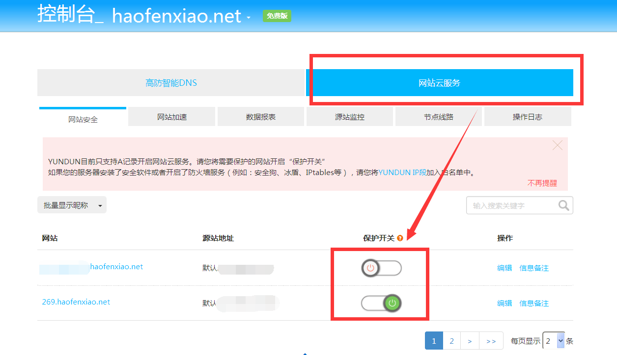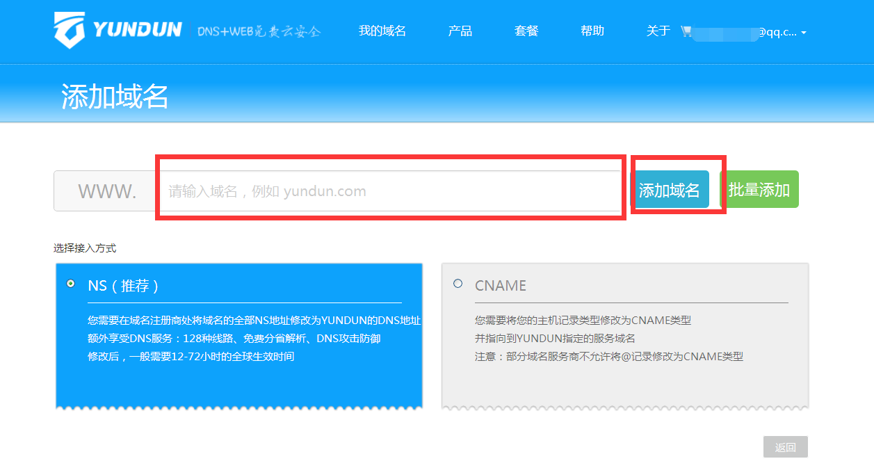 更改DNS,在域名注册平台修改域名DNS,将现有的DNS更改为云盾的DNS:ns1.cloudcdns.com ns2.cloudcdns.com 更改成功后,就可以加入云盾了。
