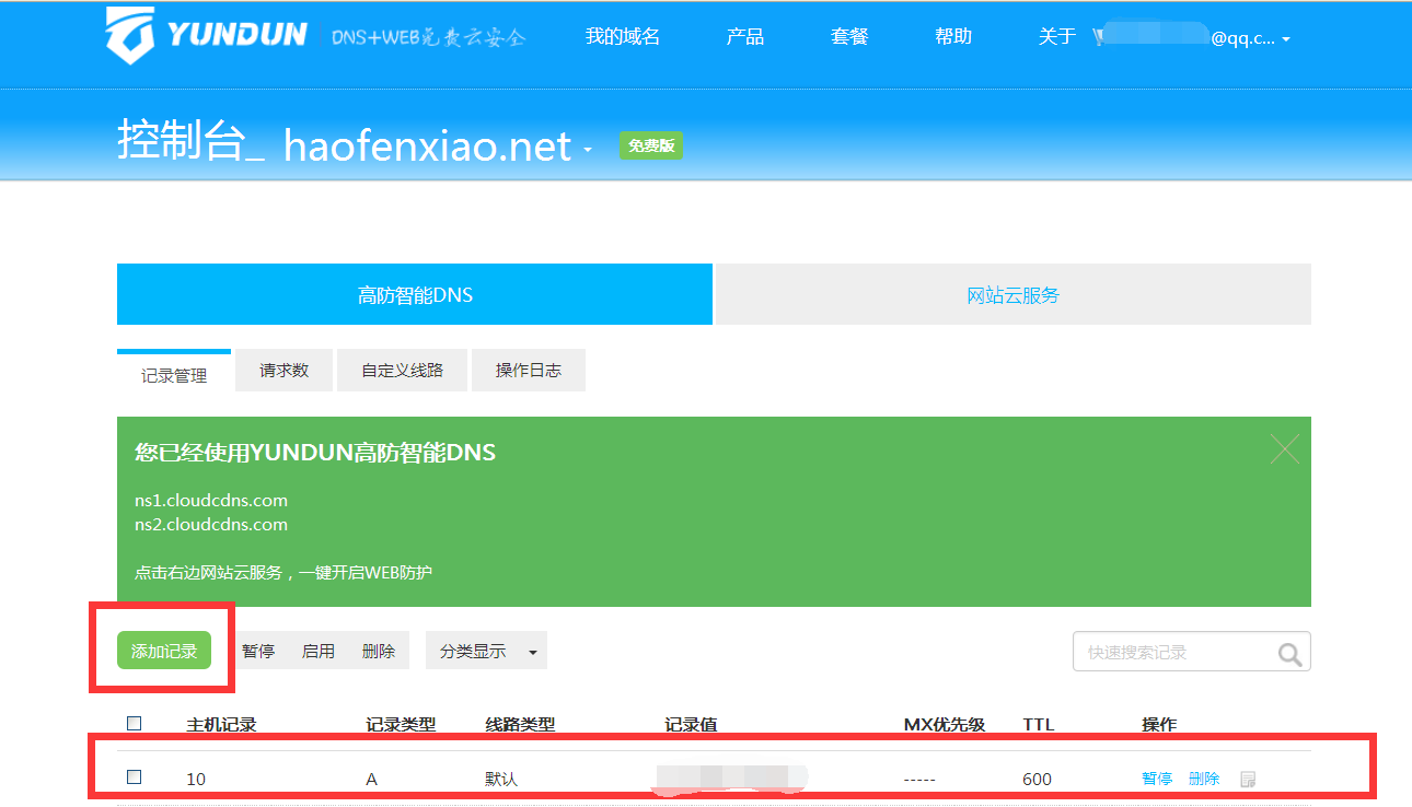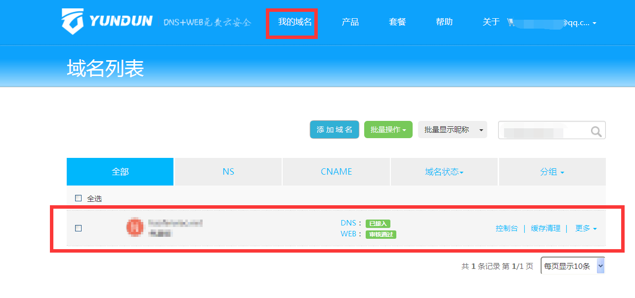 域名显示出来之后,如果DNS显示“已接入”,直接点击控制台添加解析记录,并开启云盾防护功能。