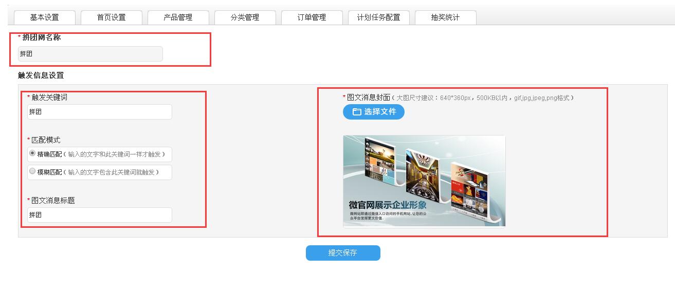 图文消息标题:在微信聊天界面输出关键字,触发关键词后,系统将弹出图文消息,图文消息的标题可以根据自己的情况自定义,系统默认拼团。