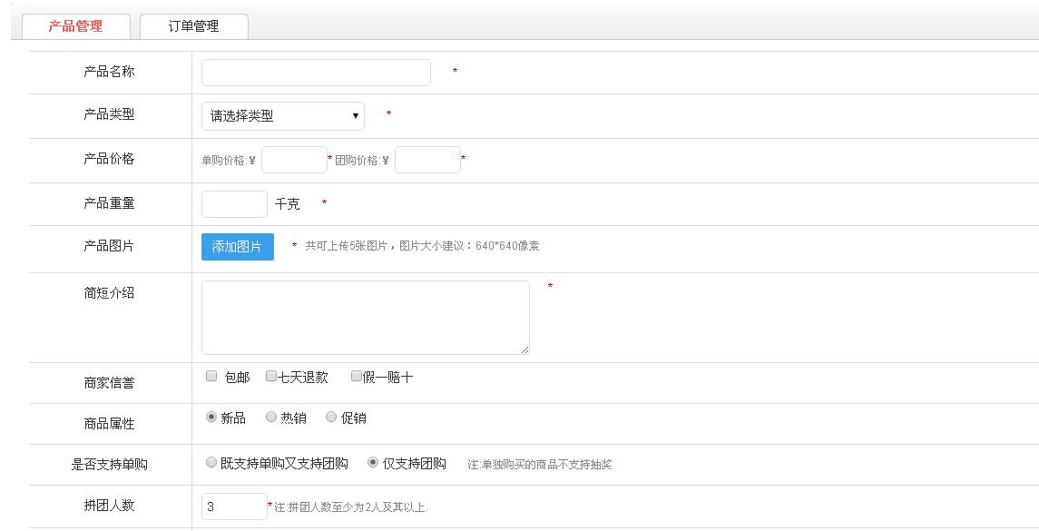 首先登陆分销商家后台,点击拼团管理,店家产品管理:在这里添加要拼团的商品