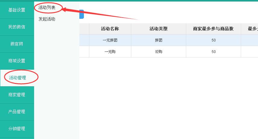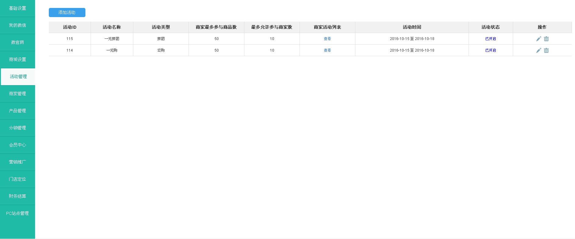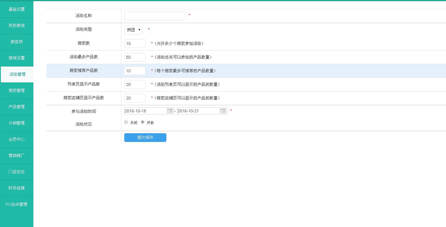 添加活动;活动名称、活动类型、商家数、活动最多产品数、商家推荐产品数、列表显示产品数、商家店铺页显示产品数、参与活动的时间(起止时间)、活动状态(开始或者关闭)