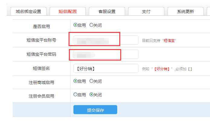 短信配置:目前平台仅支持短信宝,用于短信验证码及订单短信通知