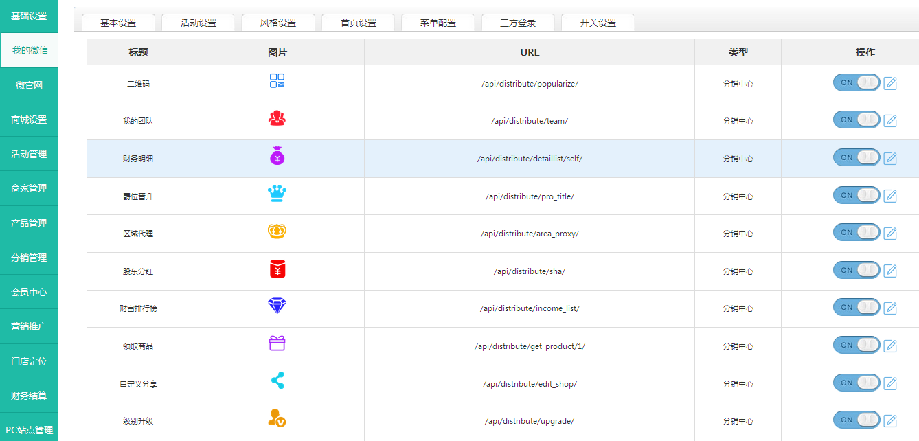 分销开关和个人开关 可根据需要选择开启 或是关闭 关闭后不在前台显示
