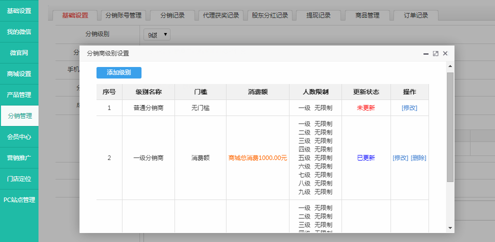 分销级别即用户设置分销系统需要多少个分销级别,若选择三级,则用户分销链只能直接管理三级分销。最多可设置9级分销。