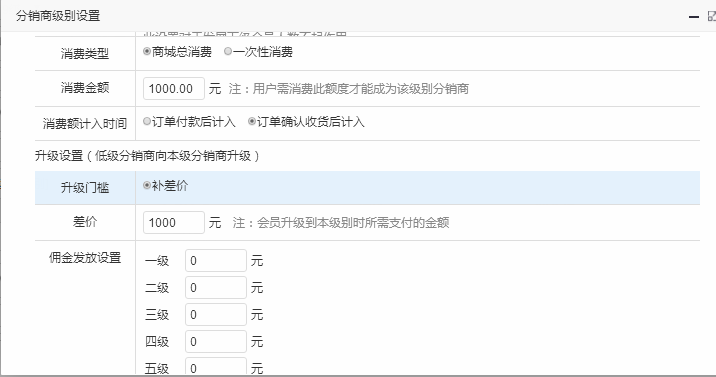 消费类型:成为本级别分销商的消费类型。消费类型可设置为商城总消费或一次性消费。