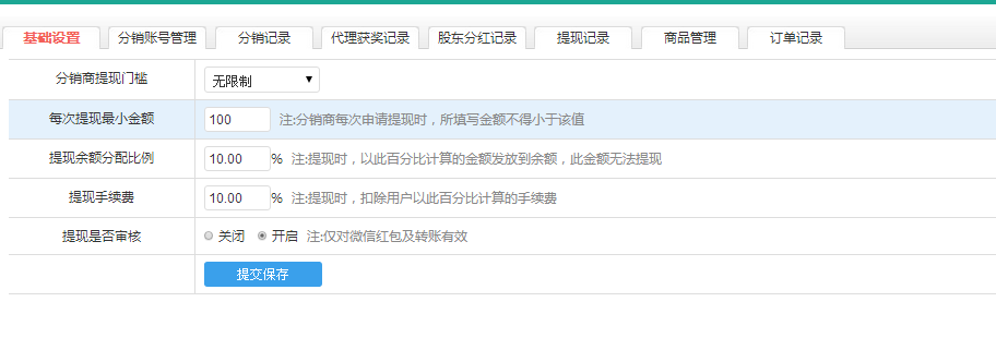 5.提现审核:只有对微信红包微信转款有效,开启后,系统后台不需要审核就可以直接发送客户佣金红包。