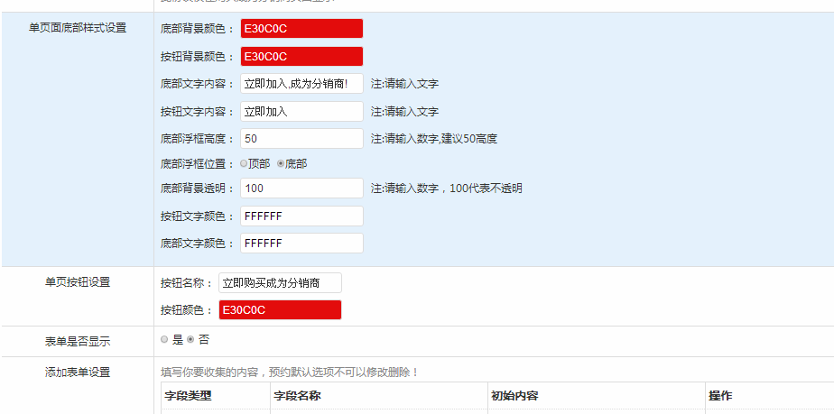 4.单页面底部样式设置 ,按钮设定指的是分销商门槛单页面的底部的设置