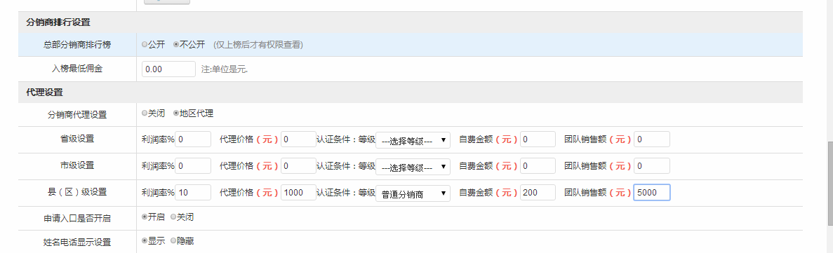 申请入口和分销商的姓名电话显示可以选择开启或者关闭
