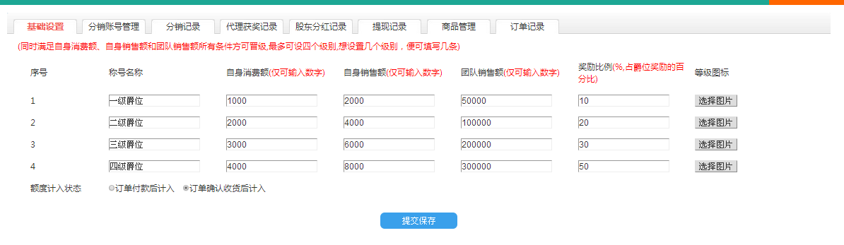 爵位设定 :设置好每个爵位级别的称号名称、自身消费额、自身销售额、团队销售额、奖励比例,这些条件同时满足之后才可以成为爵位,爵位赚取的是级差奖励,相应爵位图标可选择图片自由添加。