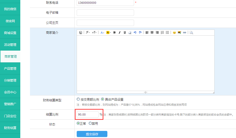 结算比例:商家财务结算时,按照结算比例款项一部分转向商家指定的卡号,剩下的部分转入商家绑定的前台会员的余额中