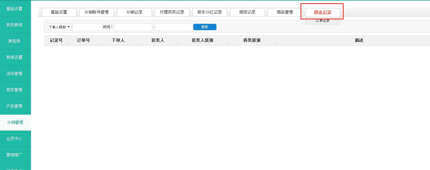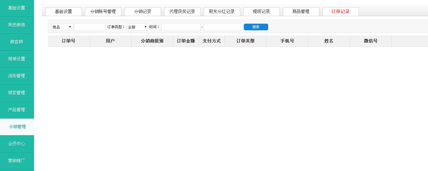 订单记录指的是客户购买分销商这个身份的记录,客户成为分销商除了无门槛,购买商品,消费额成为分销商之外,可以通过直接购买分销商的身份获得资格,该订单指的是虚拟无产品的身份, 在订单记录里面可以看到用户名字,分销商的级别,订单金额,支付方式,订单类型等信息。