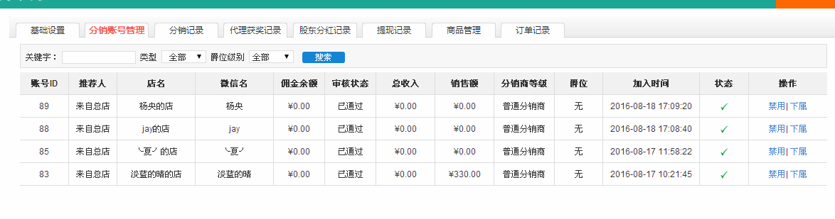 分销商账号管理点击可以进去可以看到所有分销商的信息情况,可以看到推荐人,店名,微信名,佣金余额 审核状态,总收入,销售额,分销商等级,爵位,加入时间 状态等