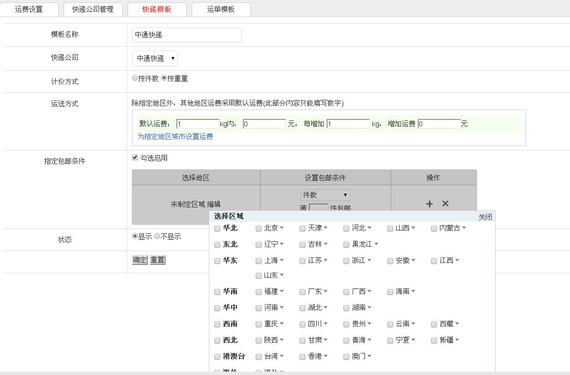 为指定区域设置运费 选择地区指定运费