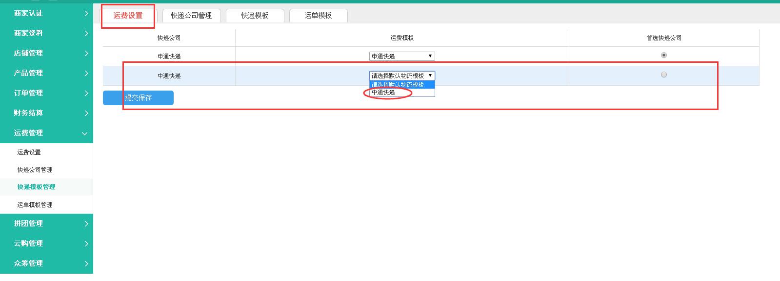 选择一个默认物流模板 并提交保存