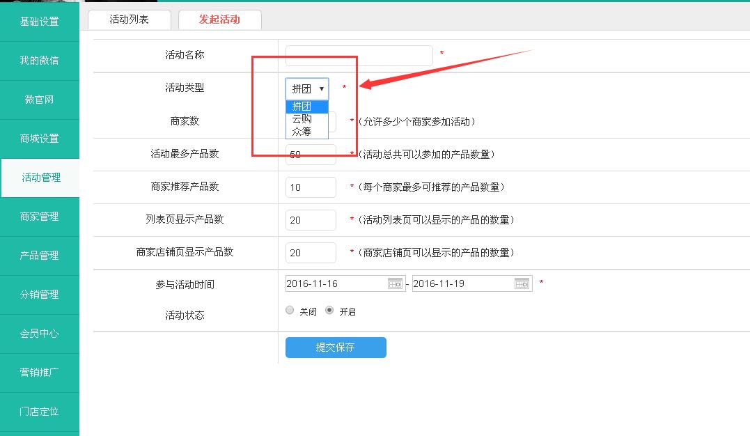 添加活动;活动名称、活动类型、商家数、活动最多产品数、商家推荐产品数、列表显示产品数、商家店铺页显示产品数、参与活动的时间(起止时间)、活动状态(开始或者关闭)