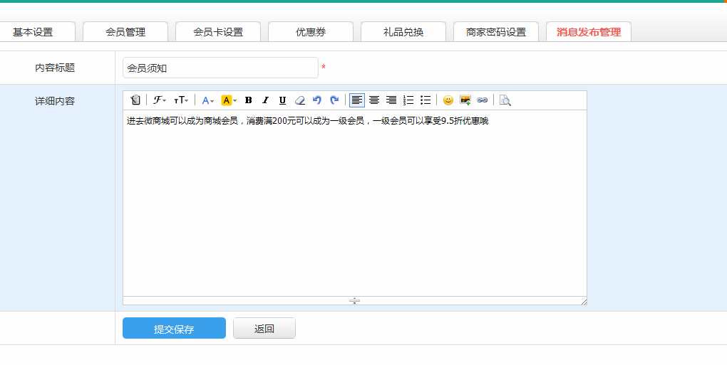 消息发布主要针对会员进行发布的一些消息须知,首先设置内容标题,设定详细内容。这个是在微商城中的会员中心里面显示