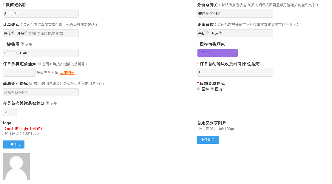 微商城名称:输入商城名称之后,会显示在手机商城首页上方