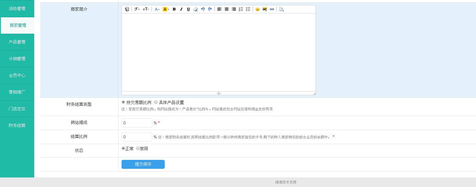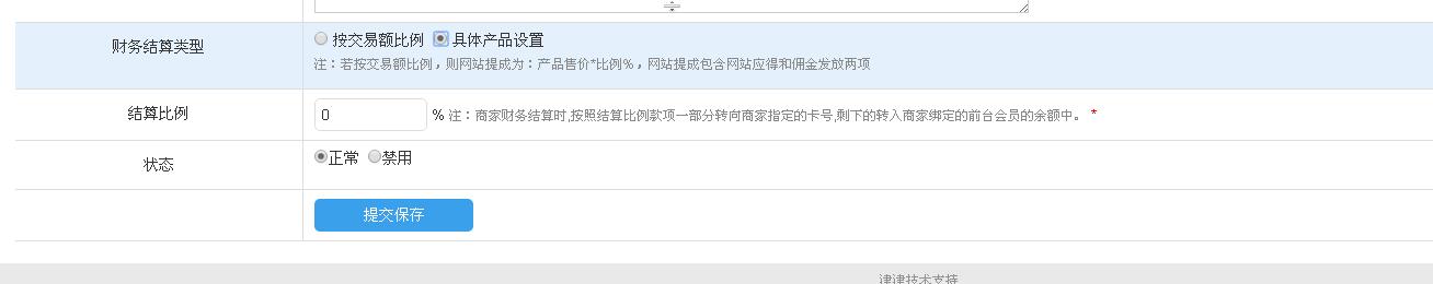 结算比例:商家财务结算时,按照结算比例款项一部分转向商家指定的卡号,剩下的部分转入商家绑定的前台会员的余额中