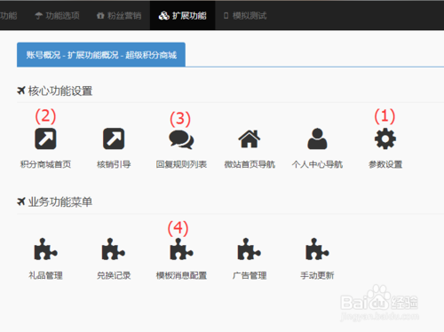 1. 非认证服务号需要借权才能使用一.在【扩展功能】中找到【超级积分商城】按照下图顺序来配置。
