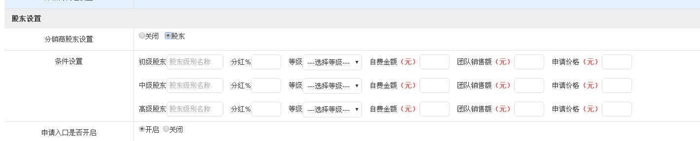 6.股东设定 达到一定的条件可以申请股东,股东指的是等级,自费金额,团队消费额都达到了某种条件之下可以获得,股东提取的是商城所有订单的佣金。