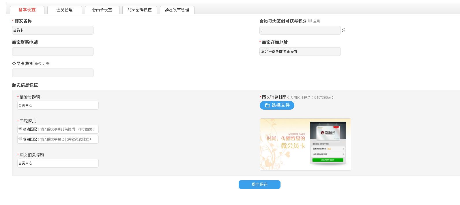 2.触发信息设置,触发关键词指的是在微商城中输入会员中心之后可以出现的图文消息里面有会员中心的基本信息。