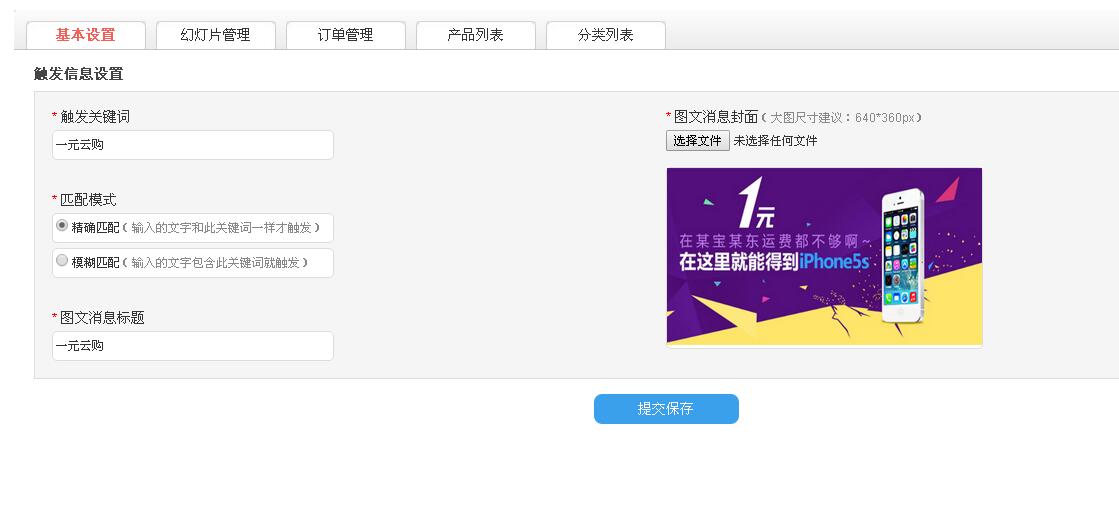1.触发关键词:设置触发云购物的关键词,如“一元云购”。也可设置多个触发关键词,但各个关键词之间需使用“|”隔开。