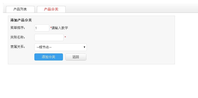 3.隶属关系:输入产品隶属于哪一类,根据产品属性确定隶属。若添加产品分类为“衬衫”,则首先需要添加产品分类“衣物”,才能把“衬衫”设置为隶属于“衣服”,否则,只能设置为根节点。