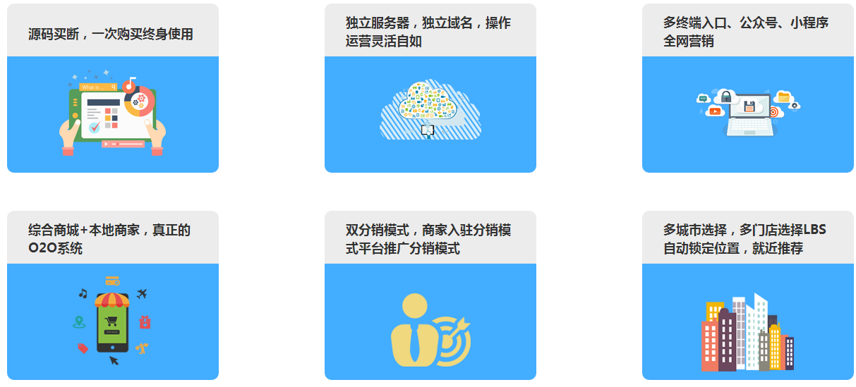 新O2O保留了原有系统的主要功能,综合商城及本地商家两个主要方向,将前端所有页面进行的改版,增加小程序端口,将商城定位成拼团类型,增加商家优惠买单、满减优惠、同城配送、上门自提等实用功能,同时将商家店铺入驻流程进行了全面升级,购物流程更流畅、功能更全面,营销体系更完善,每一处都围绕了客户的体验效果。