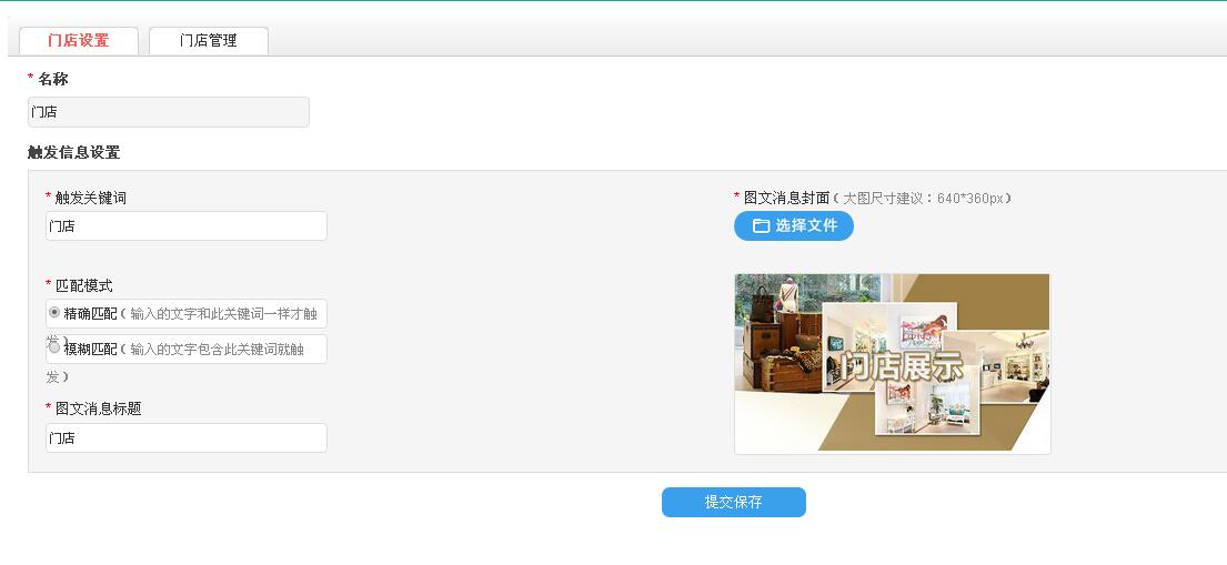 填写门店名称、并设置触发关键词,上传图文消息封面,点保存即可