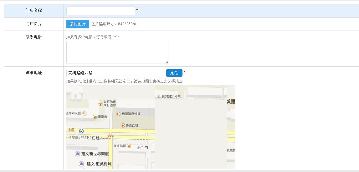 4 详细地址 填写门店地址,点击定位,如果输入地址后点击定位按钮无法定位,请在地图上直接点击选择地点