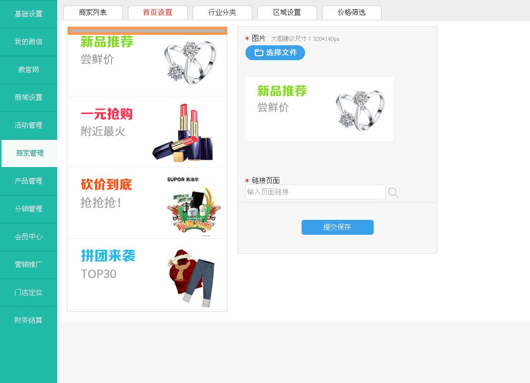 联盟商家的首页设置,根据板块添加图片和图片的链接(注:按照要求的尺寸上传图片)
