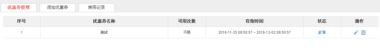 所有添加的优惠券都在这个地方显示,点击笔可以修改,点击垃圾桶可以删除