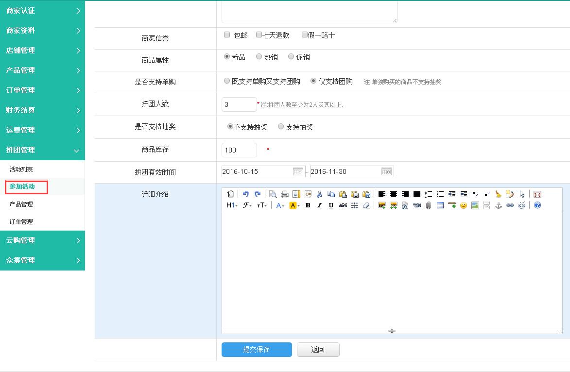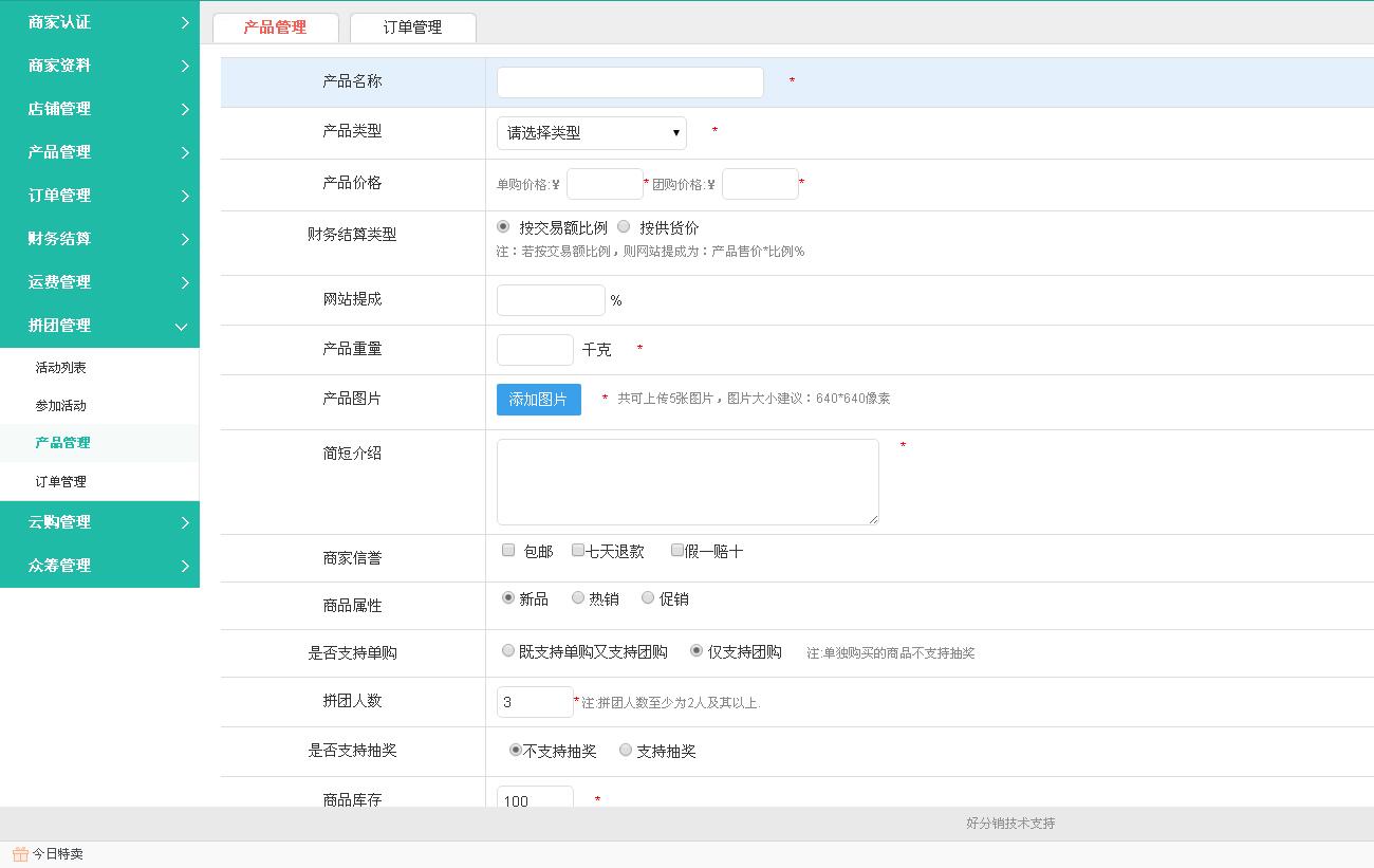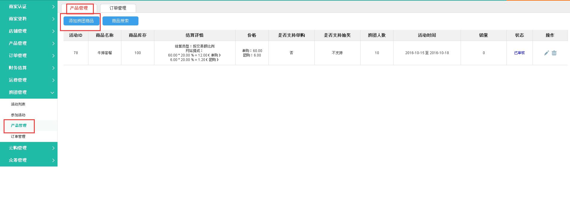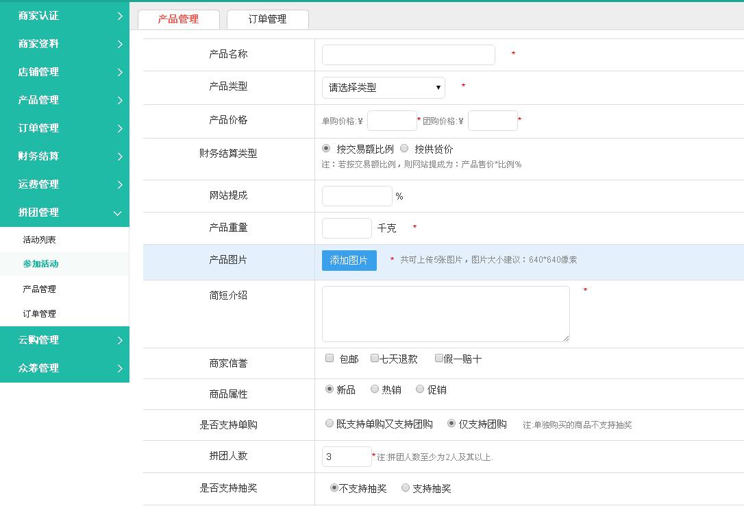 系统后台设置的拼团活动,商家可以在商家后台参加拼团活动,添加参加拼团的产品