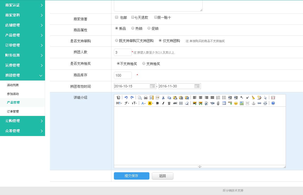 12:是否支持抽奖:可以选择不支持抽奖和支持抽奖,支持抽奖的时候,在抽奖规则那里添加抽奖的规则,中奖比率和抽奖人数。祝:抽奖,系统自动设置成团购结束当天下午六点抽奖。