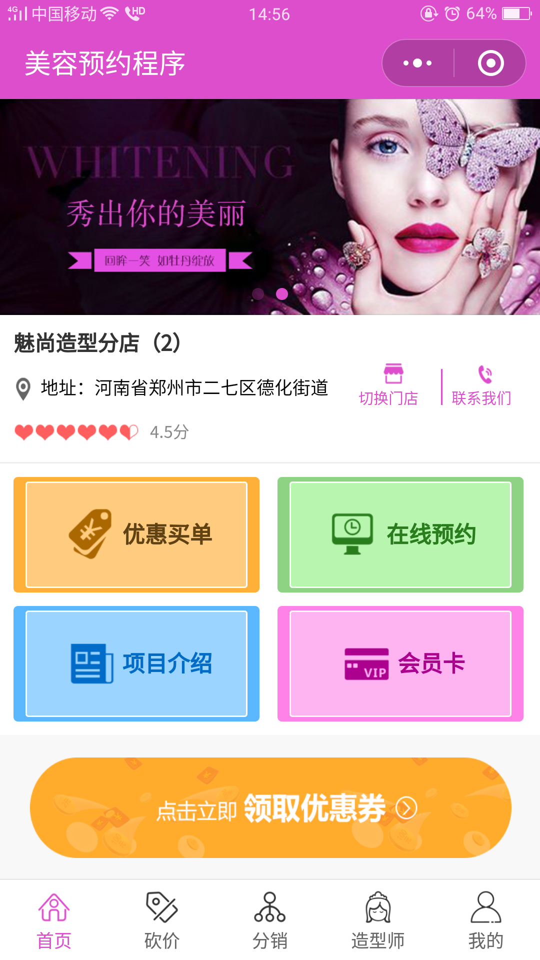 2、协助门店传播推广,在微信上宣传路径广,成本低,预约小程序可通过客户扫码收藏、转发推荐、微信公众号、微信群、朋友圈等。