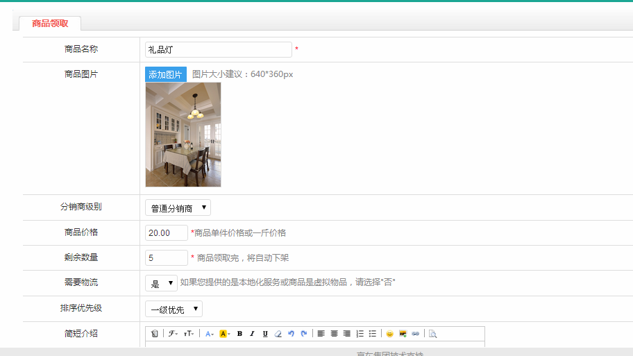 商品领取首先是需要添加商品名称,上传商品的图片,这个图片的建议大小是640*360px的格式,可以选择不同级别的分销商领取该商品,设定商品的价格,数量,介绍