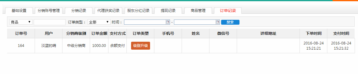 订单记录指的是客户购买分销商这个身份的记录,客户成为分销商除了无门槛,购买商品,消费额成为分销商之外,可以通过直接购买分销商的身份获得资格,该订单指的是虚拟无产品的身份, 在订单记录里面可以看到用户名字,分销商的级别,订单金额,支付方式,订单类型等信息。