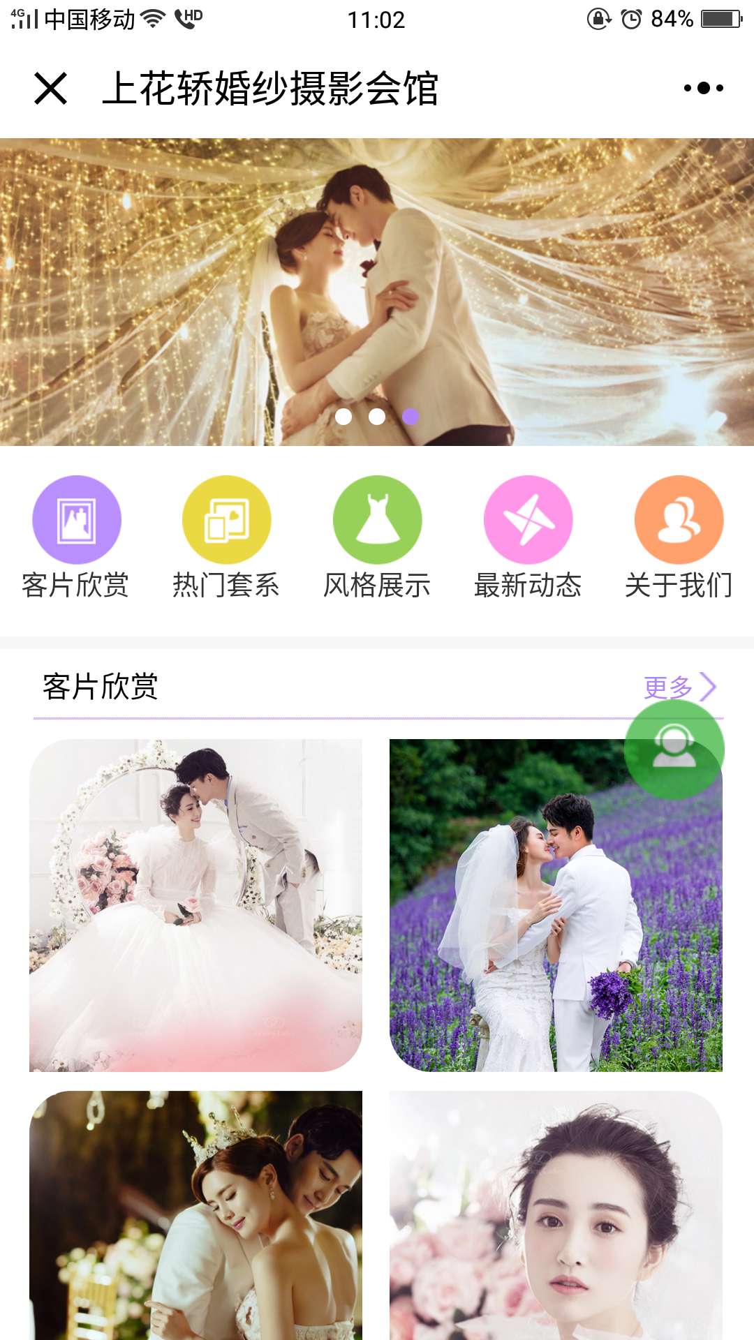 2、小程序页面展示拍摄风格,用户选中心仪的套餐可以直接在小程序上联系商家预约,实现消费。小程序不仅提供了丰富的产品展示平台,还能带来时效性的销售线索。用户还可以利用小程序的在线客服功能,向商家咨询了解相关业务,优化沟通渠道,方便快捷,提高商业转化率。