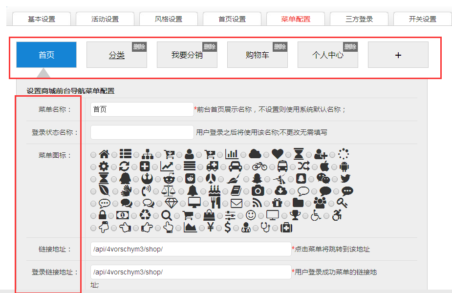 菜单配置内置菜单分为首页、我要分销、购物中心、我的中心。设置商城前台导航菜单配置方法相同。以下以“首页”为例。