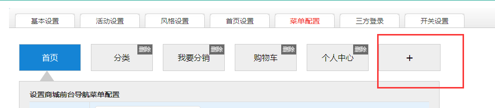 可添加自定义菜单,如“分销模式”、“分销圈”等。点击下图红框内“+”,即可添加菜单。最后重复第二步,点击保存即可。