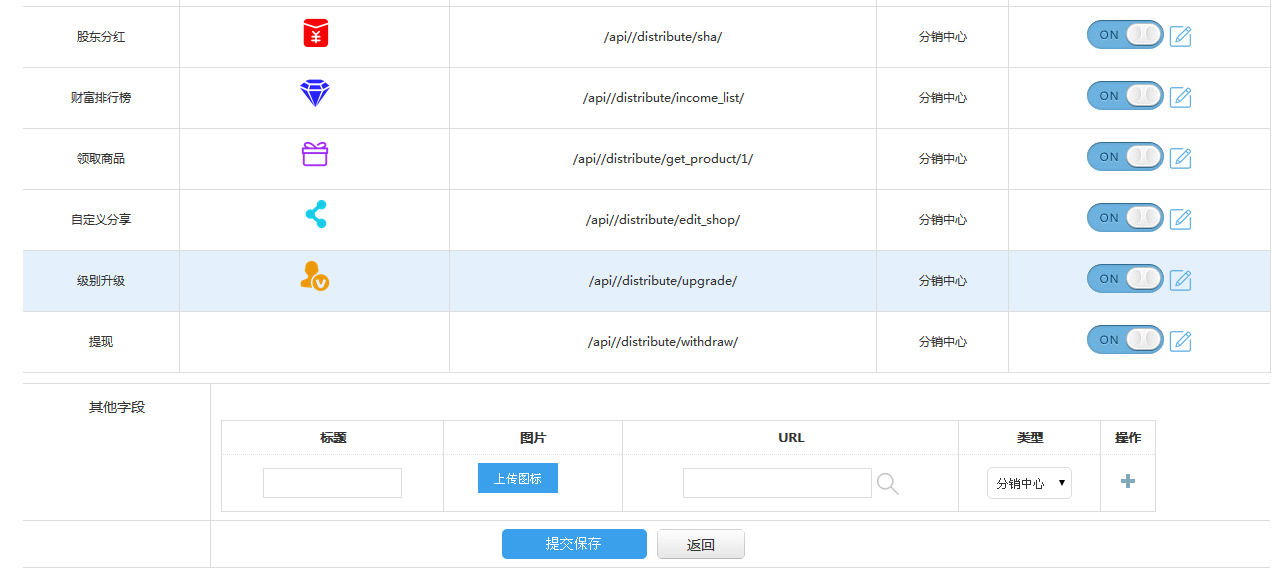 分销商可以根据自己的情况自定义制定“标题”,“图片”,“URL”“类型选择”等最后“提交保存”就可以了