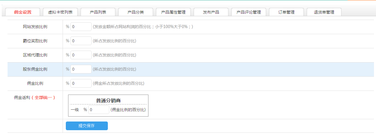 网站发放比例占利润的百分比,小于100%,大于0%,佣金设置里面包括爵位奖励比例,区域代理比例,股东代理比例、佣金四个部分,佣金又可以分为不同等级的佣金,这四种佣金都是从网站发放比例里面合理分配出来的。